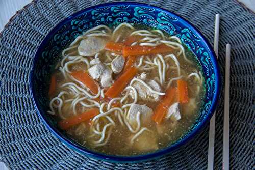 Soupe de poulet aux nouilles asiatiques Une recette simple et rapide parfaite pour utiliser des restes de poulet rôti que l'on effiloche.