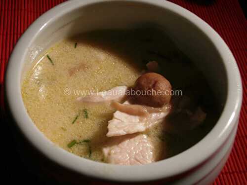 Potage Epicé de Poulet et Champignons Au Lait de Coco (pour 4 personnes) Ingrédients: 200 gr de blancs de poulet 100 gr de shiitake (ou autres : volvaires, champignons de Paris) 25 cl de lait de coco 1 tige de citronnelle Quelques brins de coriandre.
