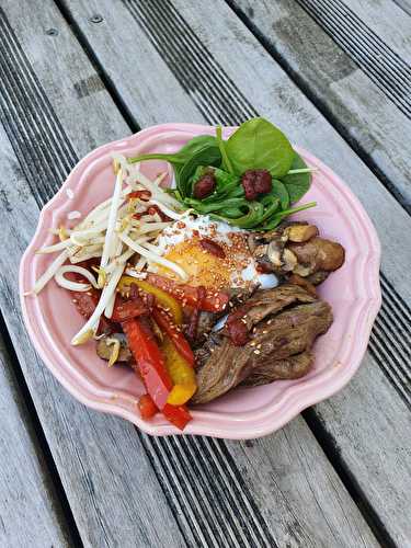 Ma version du Bibimbap, ce plat coréen servi dans un bol, cuit à la plancha pour plus de facilité de cuisson
