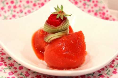 Un petit sorbet fraises-rhubarbe pour ce week-end, ça vous dit ? 450 g de fraises équeutées 300 g de rhubarbe 80g d'eau 80g de sucre 60 g de sirop de glucose 1/2 citron Faire un sirop avec le sucre, le glucose , et l'eau , et y pocher la rhubarbe coupée.