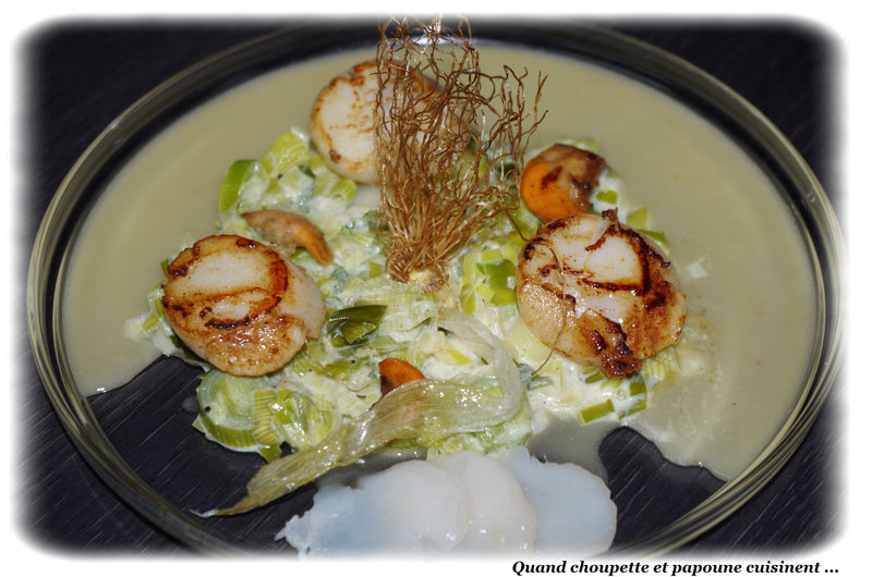 De belles noix de saint Jacques m'ont fait de l’œil chez le poissonnier et comme j'avais des poireaux à terminer, ce sont des Saint Jacques à la fondue de poireaux qui se sont retrouvées au menu: une assiette à la fois goûteuse et pleine de délicatesse,.
