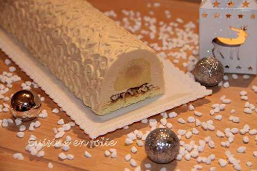 Recette de la bûche de Noël vanille, caramel et noix de pécan.
