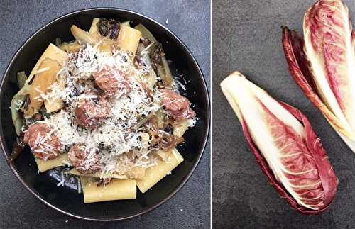 La recette de pâte à la saucisse de toscane et trévise ou traduisez Paccheri salsiccia toscana e radicchio di Treviso du Chef Antonio du restaurant Cocina