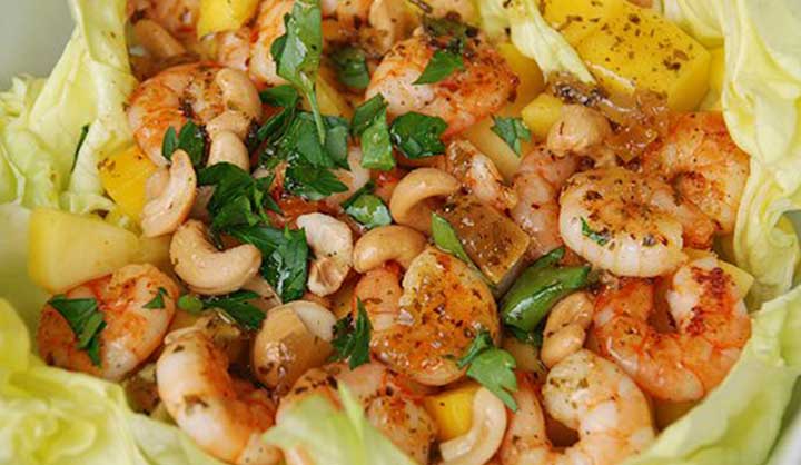 Ajoutez la salade, les crevettes et la mangue. Parsemez de quelques noix de cajou et de coriandre fraîche.