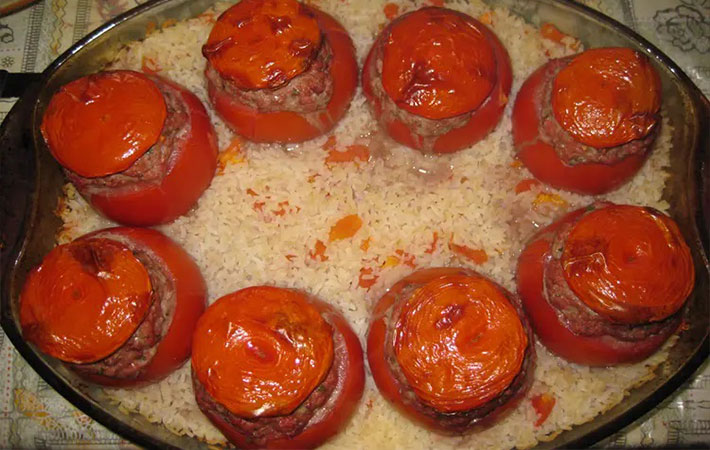 Faire un beau lit de riz au fond d’un plat. Déposez les tomates sur ce lit de riz. Enduire les chapeaux d’un peu d’huile. Parsemez les de chapelure, et mettre un peu de pulpe de tomates et de jus entre elles.