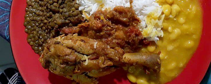 Cari de poulet sans tomates avec un riz jaune créole, des grains et deux rougails pimentés.