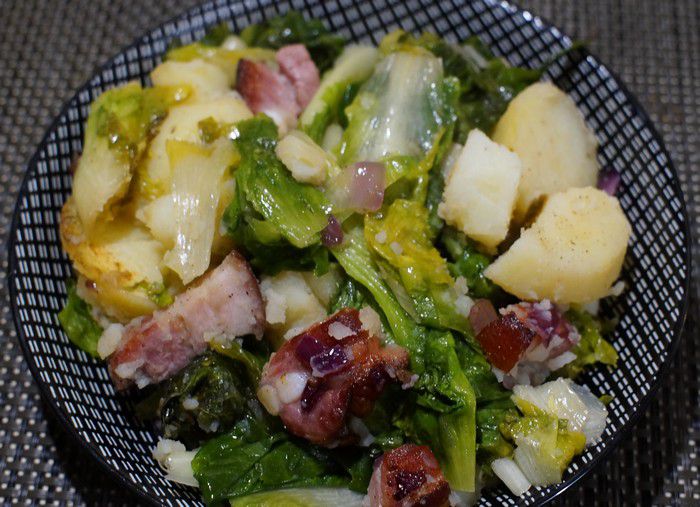 Une salade qui fera une jolie entrée ou un repas du dimanche soir devant la télé…Ce que j’aime avec les salades, c’est que suivant les saisons, on les agrémente comme on veut: bil…