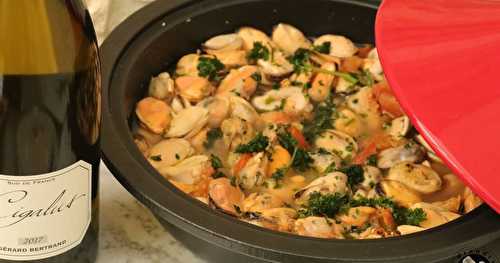 Tajine de moules au safran Une recette très rapide de tajine que j’ai proposée accompagnée d’un vin Gérard Bertrand « Cigalus ».