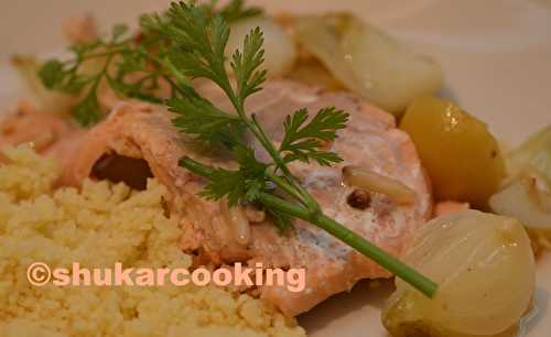 5 paves de saumon 5 petits citrons confits ou 2 gros citrons confits 8 oignons nouveaux plus 1 oignon sec 2 càs de raisins secs 1 càs de graines de lin (ou pignons de pins) 1 càs de graines de sésame 1 càs de graines de coriandre 1 càs de miel huile.