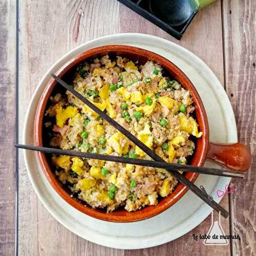 Chou-fleur râpé et préparé à la façon d'un riz cantonais avec des petits pois, du lard et une omelette ciselée.