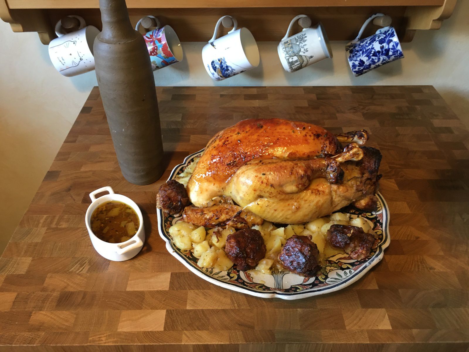 Rôti de coq de basse cour, élevé à l'air libre ou chapon bien dodu à la chair savoureuse que j'avais préparé pour le repas du nouvel an de l'an dernie