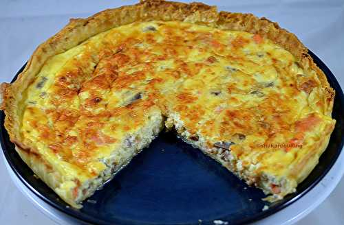 1 pâte feuilletée 400 g de brousse 100 g truite fumée 100 g de thon fumé 2 œufs 50 g de comté râpé Chauffer le four à 220°.