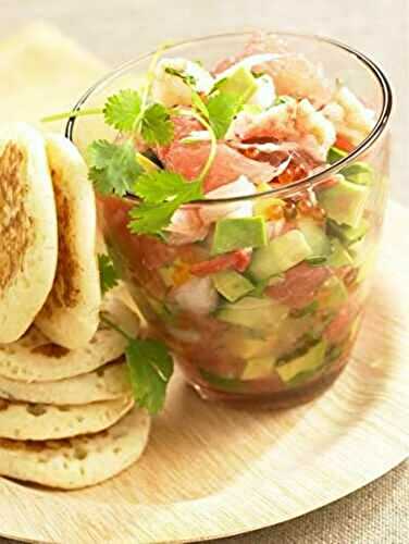 Préparation : 20 min Ingrédients pour 6 Personnes: 150 g de crevettes roses cuites décortiquées 2 pamplemousses roses 2 avocats 1 petit concombre le jus d'½ citron 1 petit bouquet de coriandre fraîche 1 petit pots d'œufs de saumon ou de truite.