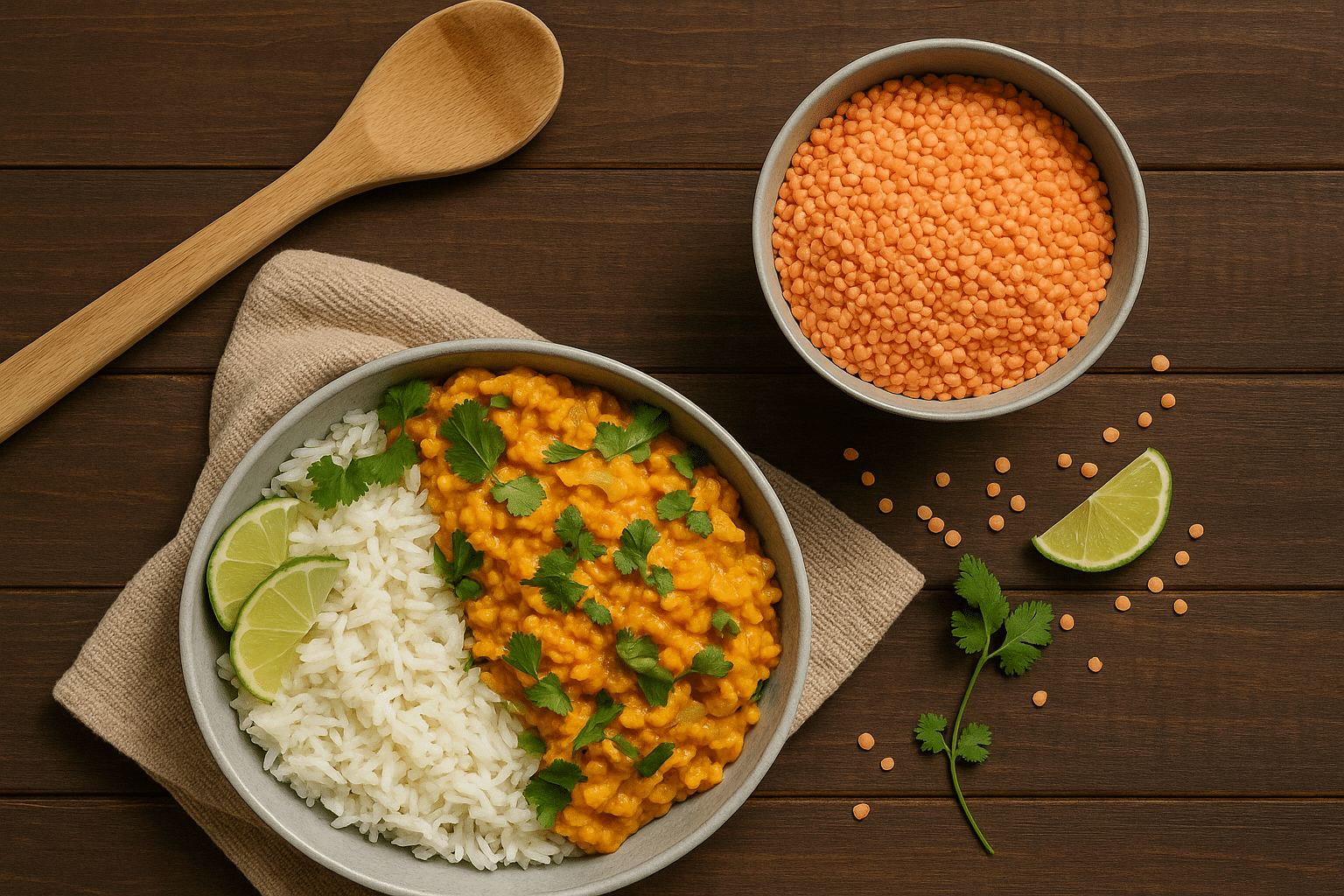 Curry de lentilles corail au lait de coco, un savoureux plat à base de lentilles parfumé au curry, facile à réaliser pour un repas léger