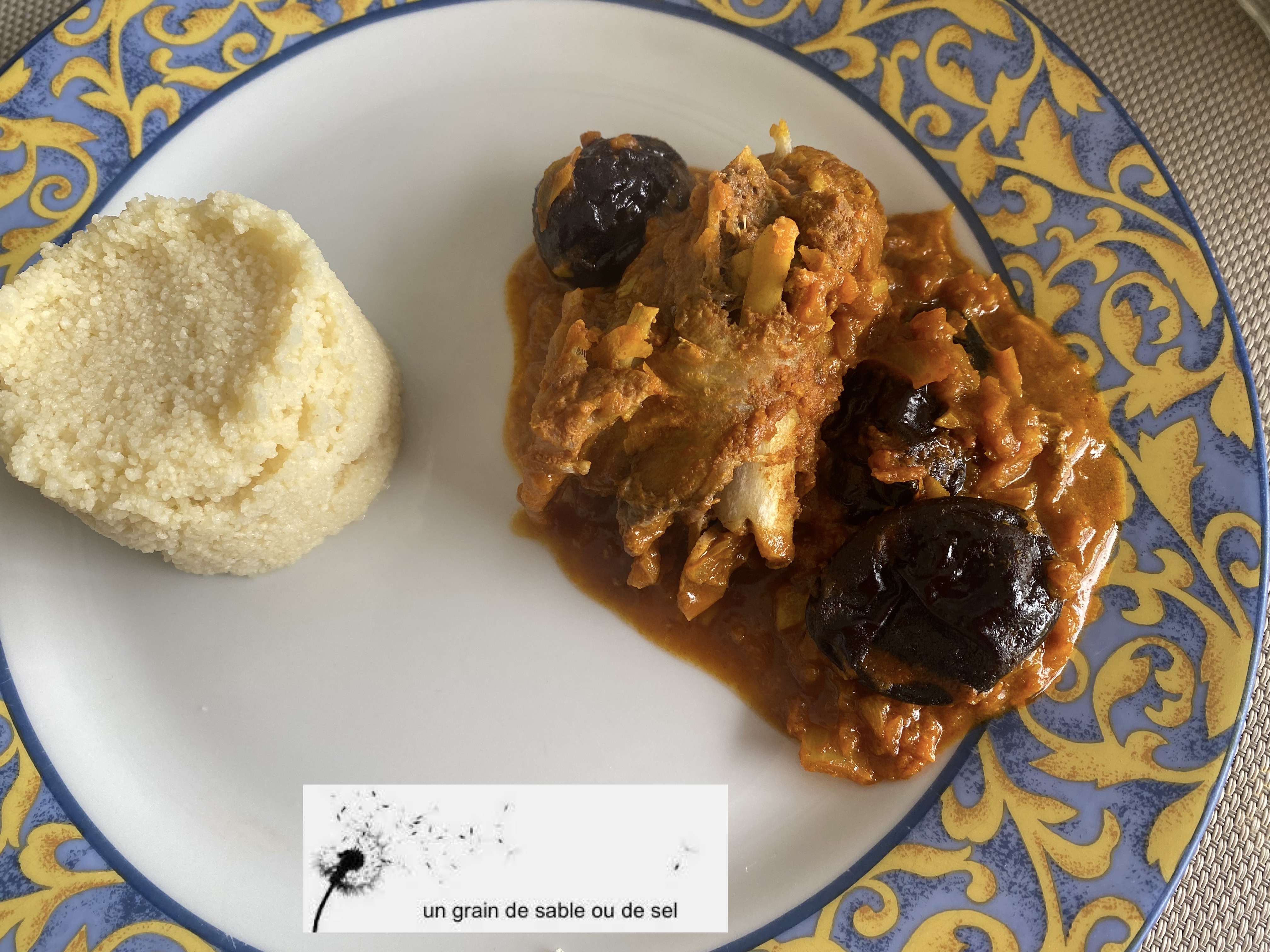 1 épaule d’agneau désossée et coupée en cubes 2 oignons 12 pruneaux 80 g d’amandes effilées feuilles de laurier huile d'olive 1 càs de miel 2 càc de ras el hanout 2 càc de Cumin moulu 1 bâton de cannelle sel 1 càs de sésame Émincer finement les oignons.