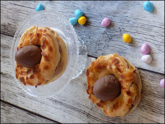 Un dessert de Pâques qui fait son effet! Pour le défi "gourmandises de Pâques" du test entre blogueurs, j'ai décidé de reprendre l'idée du Paris-Brest à la crème de Pralin de Michelle du blog les Plaisirs de la maison pour en faire de petits nids de.