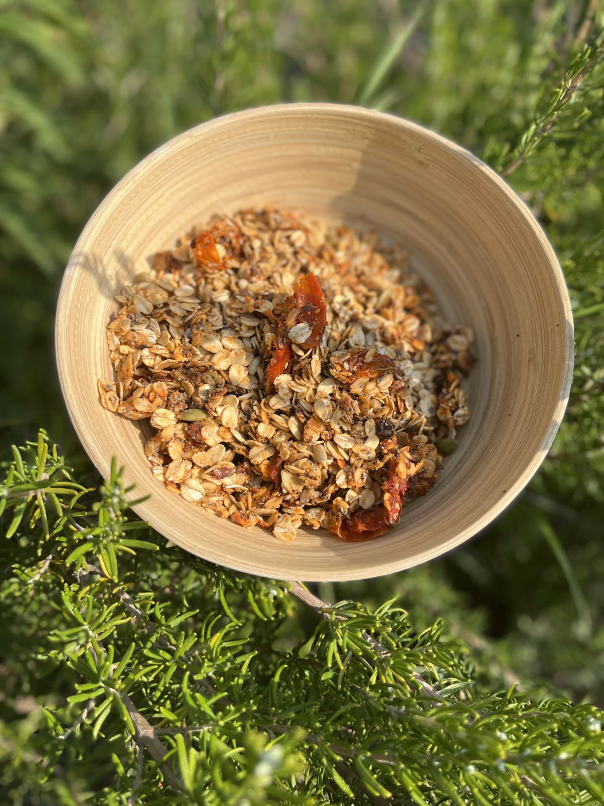 Granola salé aux saveurs de la Provence avec des tomates séchées, du thym, des pignons de pins, de l'ail, du parmesan ou du chèvre et un peu de piment pour relever le tout.