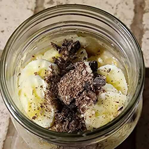 INGRÉDIENTS : 1 banane écrasée 1/2 cup de flocons d'avoine (125g) 1 tbsp (CAS) de miel 3 tbsp (CAS) de beurre de peanut (cacahuète) 1/3 cup (80g) de lait d'amande Topping : Quelques rondelles de bananes 2 tbsp (CAS) de peanuts PRÉPARATION : Mettre tous.